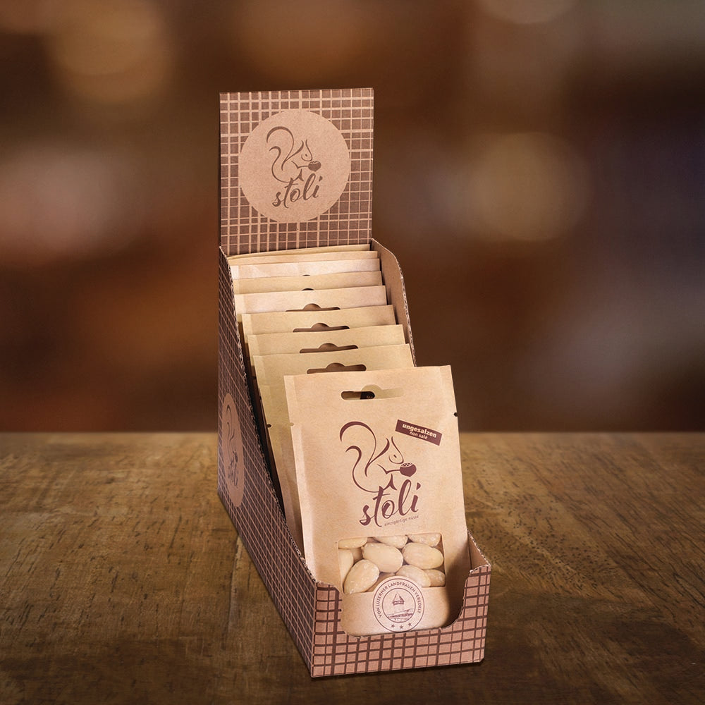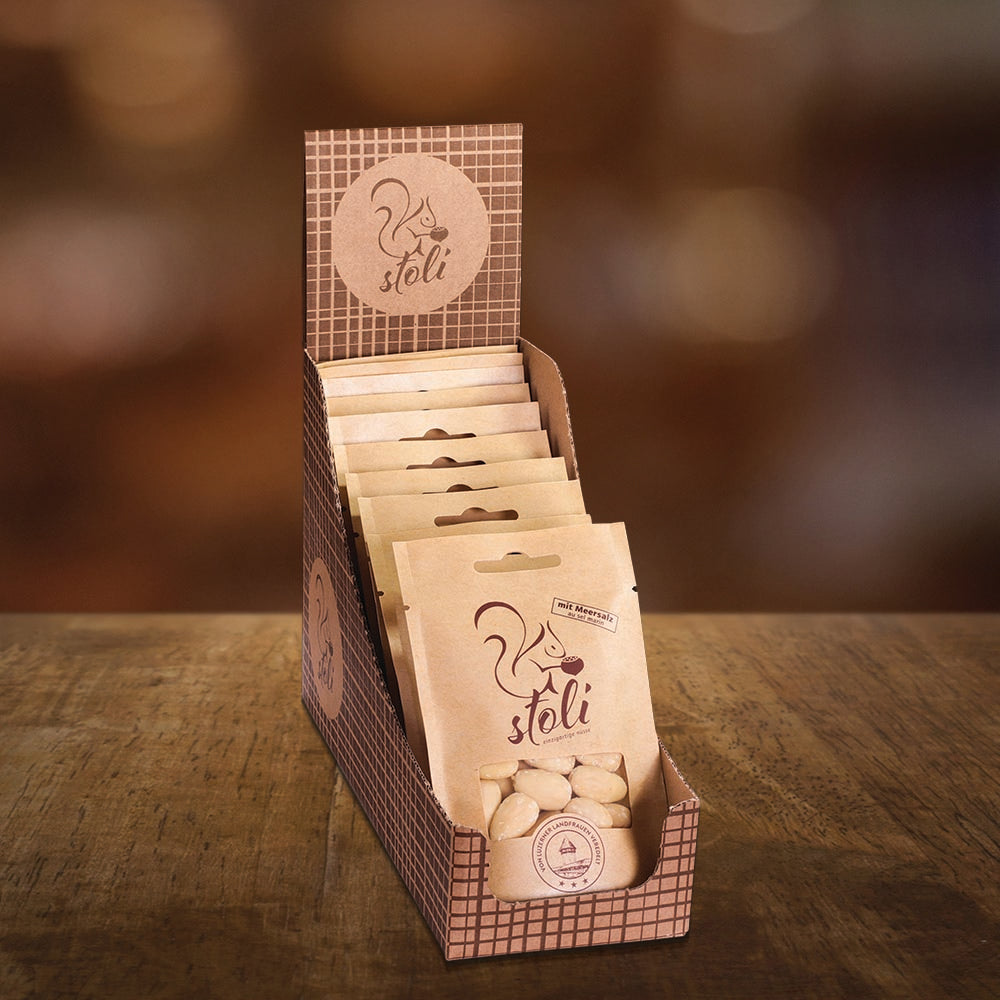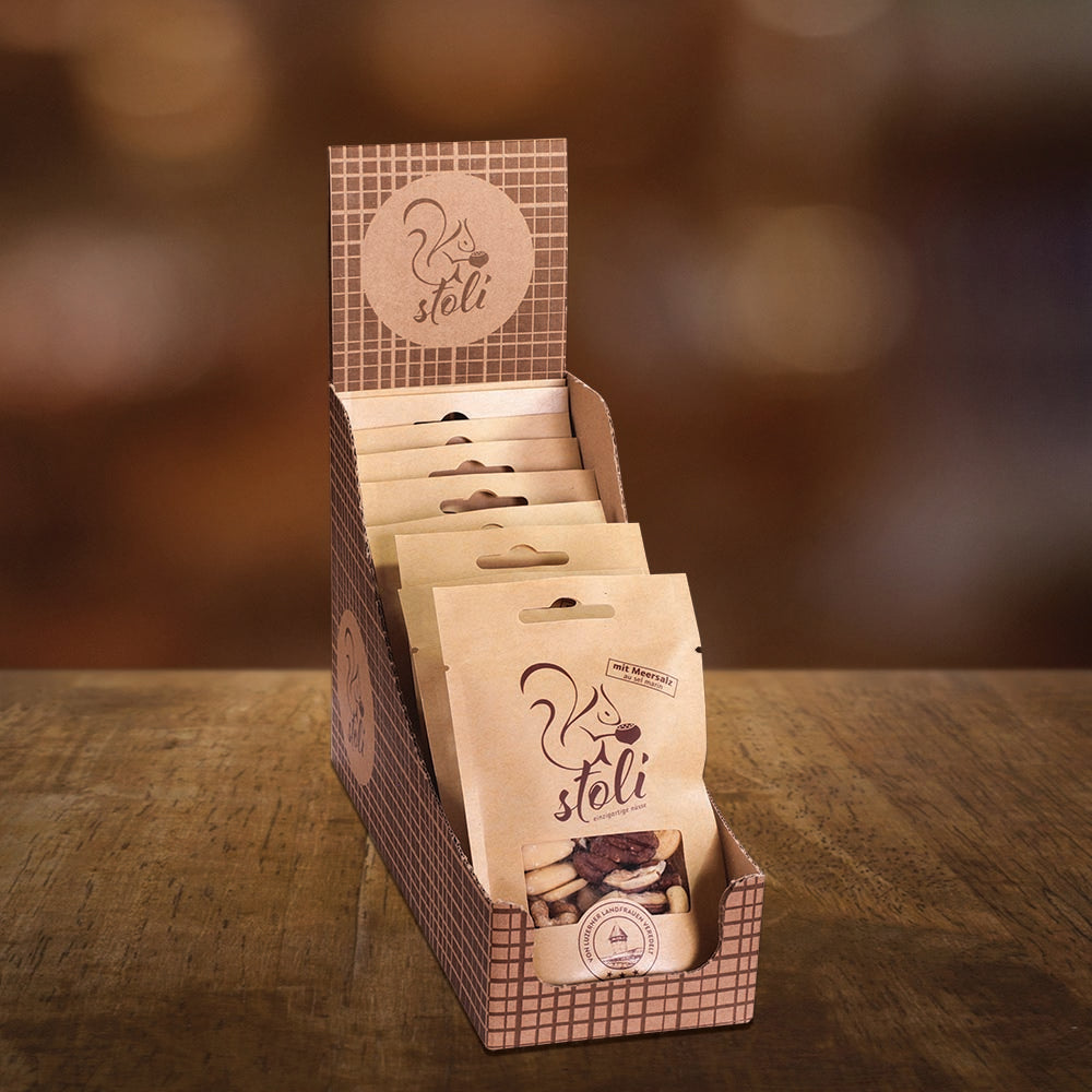 L'idéal est de proposer les noix aux employés au prix coûtant. Comment ça marche ? Lorsqu'un employé prend un sac, il dépose 1,00 $ dans la caisse. C'est une solution économique pour votre entreprise. Dix rations quotidiennes sont emballées dans une boîte en carton. Vous pouvez facilement retirer le couvercle et exposer la boîte. Sur demande, nous pouvons également vous fournir un présentoir à rations quotidiennes en acier chromé et en bois de noyer. Il comporte six supports pouvant accueillir cinq sacs chacun.